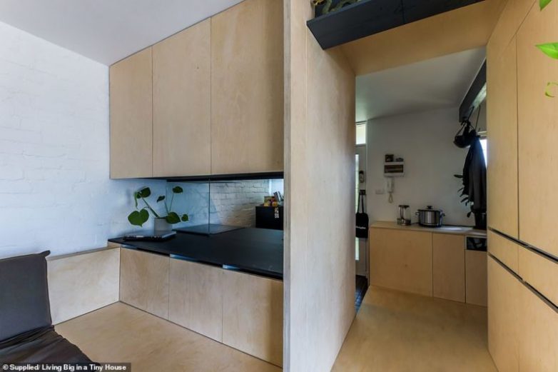 Общая площадь кухни составляет всего 1,8 кв. м., но, что удивительно, здесь есть всё, что нужно, для комфортной жизни! С помощью стальных балок архитектор может строить собственные «стены» там, где он посчитает нужным. На этой крошечной кухне установлены полноразмерная плита, вытяжка, посудомоечная машина и полноразмерные кухонные шкафы.