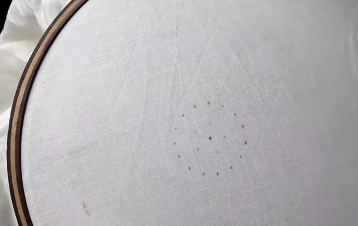 Заправьте ткань в пяльцы, приложите к середине шумовку и карандашом сделайте отметки для будущего узора.