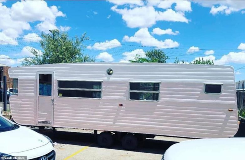 Так потертый старый фургон превратился в стильный домик на колесах с бледно-розовым и белым оформлением снаружи.