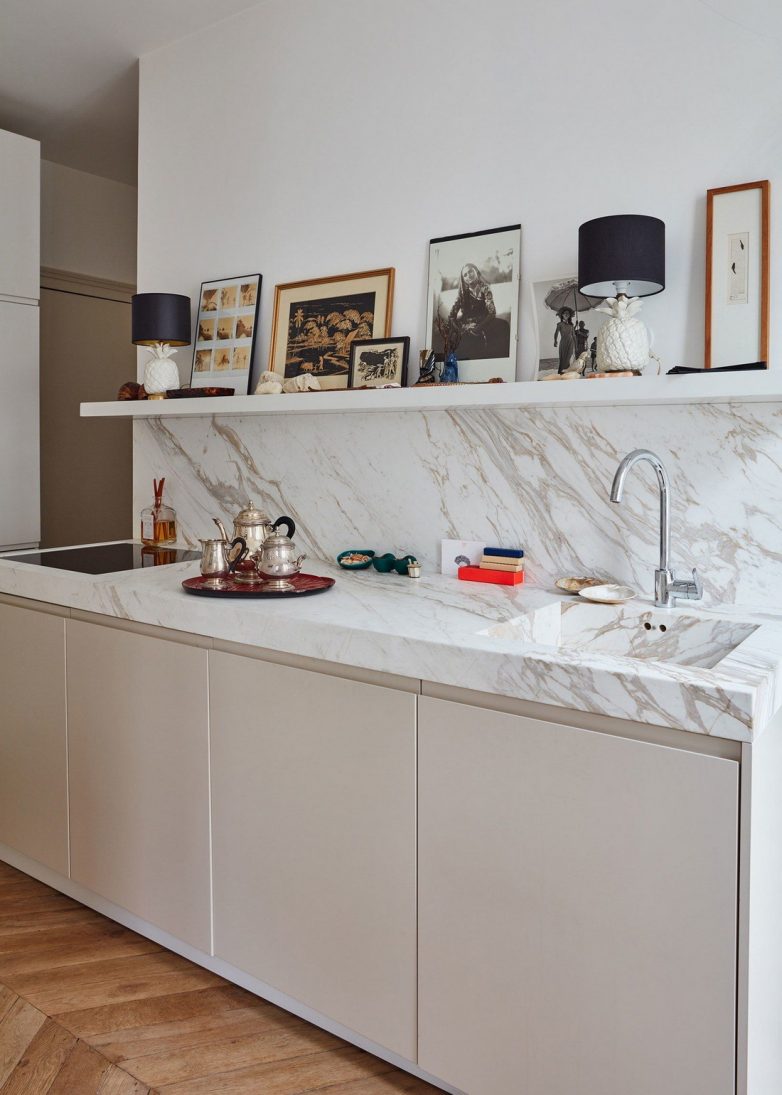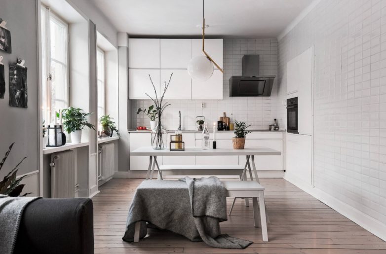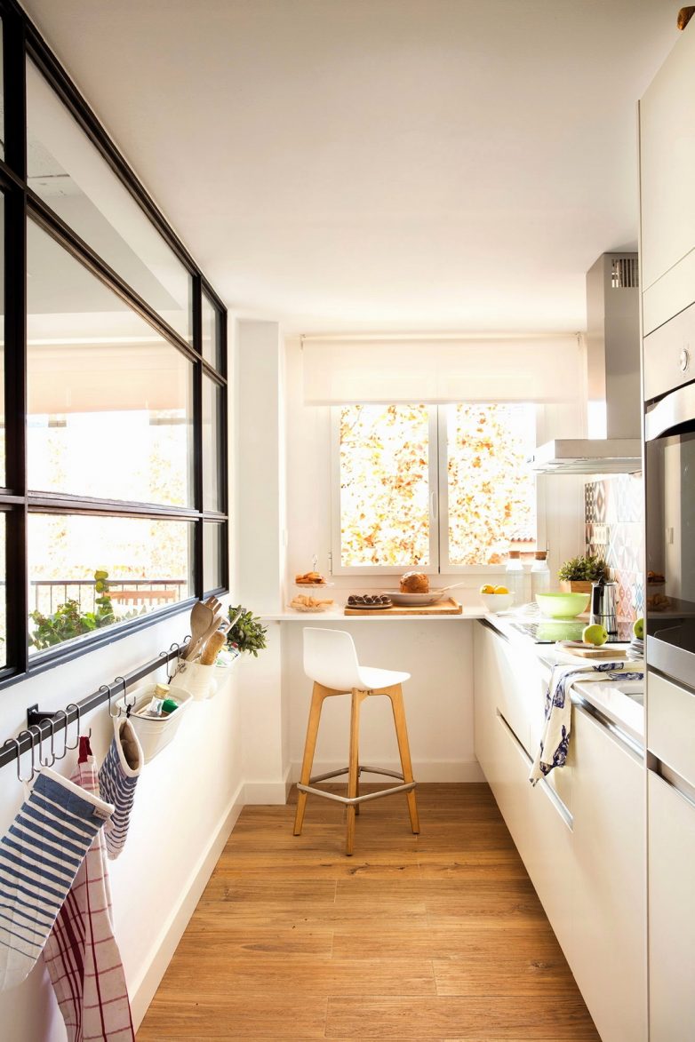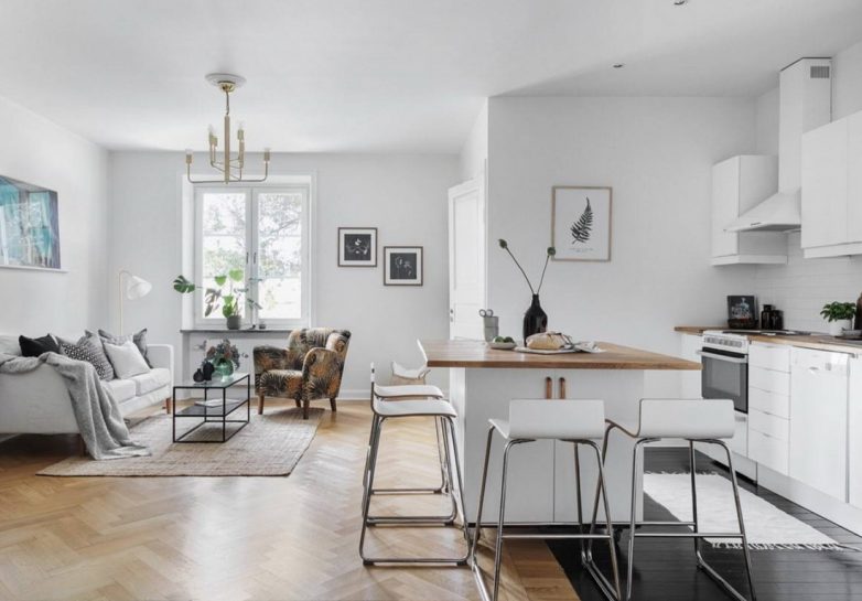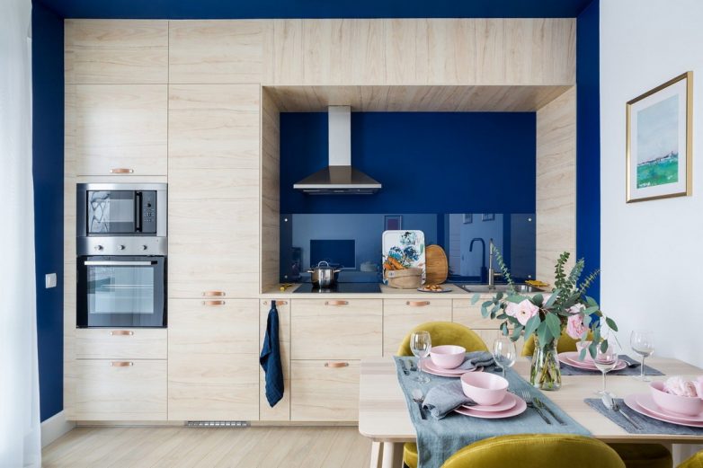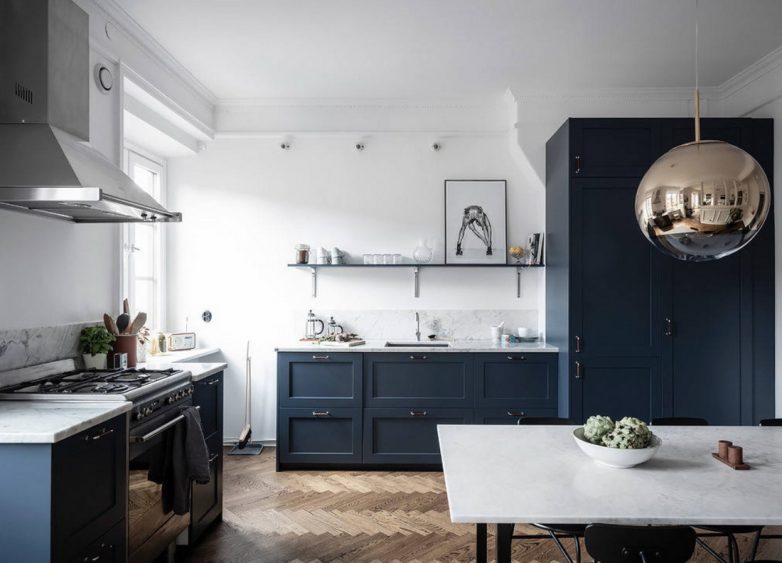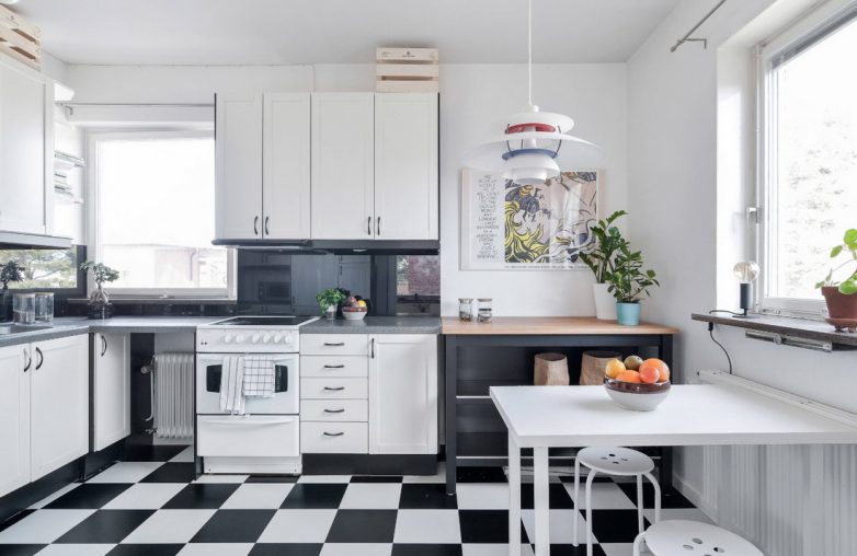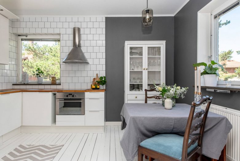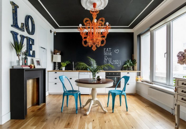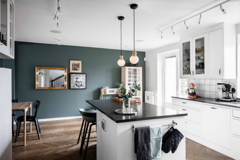 Интересным решением является использование нескольких цветов для разделения кухни на зоны: рабочую и место для отдыха.