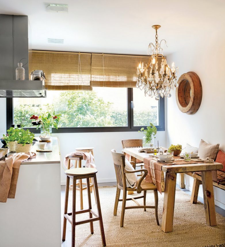 Оконные проемы не нужно перегружать особыми тканями и формами. Оптимальным вариантом будет короткий тюль и короткие занавески, подобранные в соответствии со стилем. Дачную кухню можно украсить вазой с букетом полевых цветов, а на стол положить вязаную салфетку и поставить плетеную низкую корзинку с фруктами.