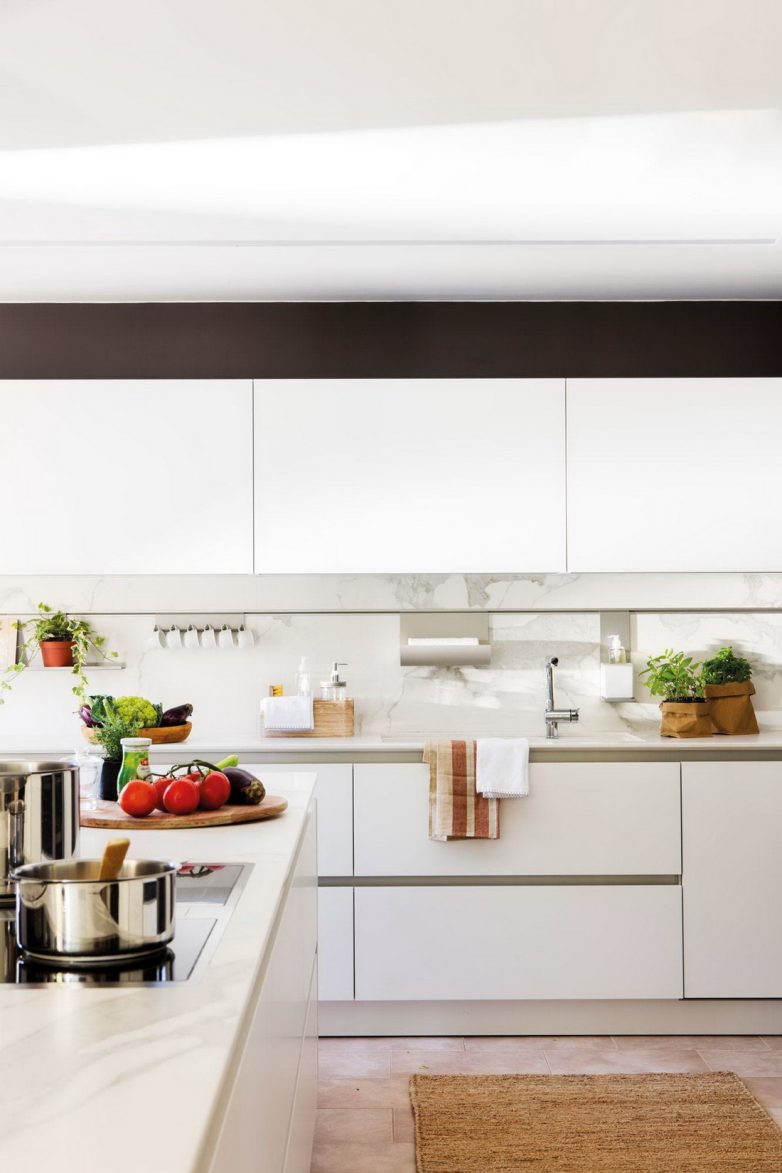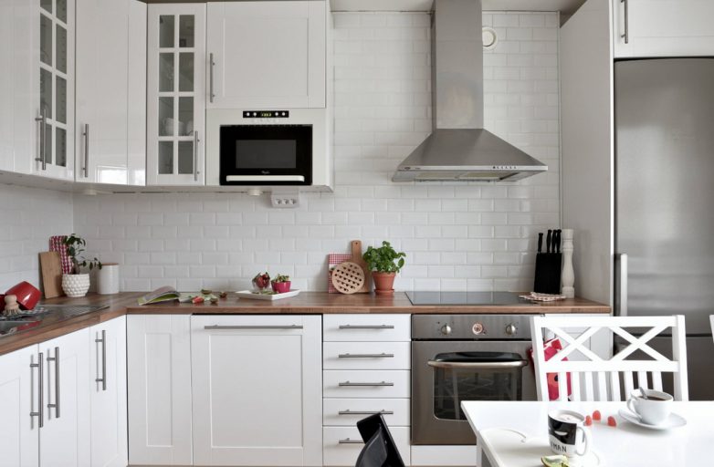 Если вы на даче проводите много времени, то, как правило, здесь используется большое количество посуды. Чтобы спрятать кастрюли, сковородки и другие кухонные девайсы, предусмотрите вместительные навесные и напольные кухонные шкафы.
