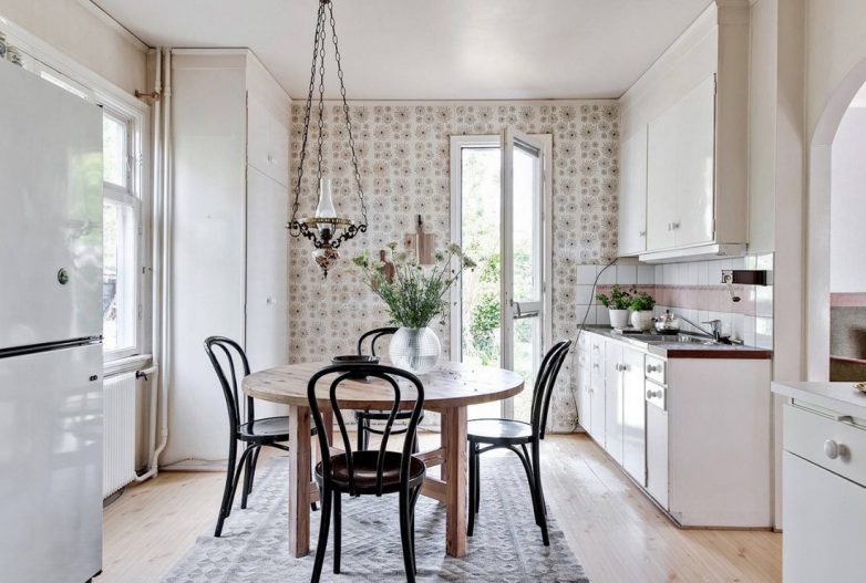 Выбор материала для отделки стен дачной кухни является делом непростым. Из-за большой влажности бумажные обои явно не подходят в качестве настенного покрытия, а недорогая краска тоже может быстро облупиться.Оптимальный вариант – это наклейка виниловых или флизелиновых обоев, окрашивание влагостойкими красками или отделка керамической плиткой. Почитатели стиля лофт оставляют кирпичную кладку стен в первозданном виде.