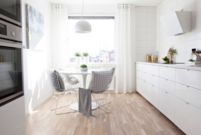 Для обновления шкафов можно использовать самоклеющуюся пленку или покраску, для накрывания столов приобрести новые скатерти, а для обтяжки стульев использовать красивый текстиль. При покупке мебели необходимо выбирать влагостойкие материалы, которые и летом, и зимой буду хорошо выдерживать температуру.