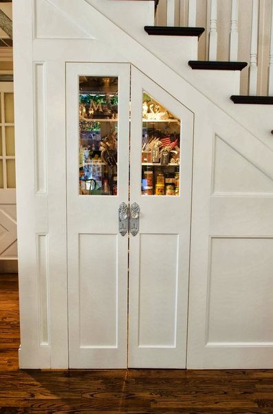 Под лестницей можно встроить целый шкаф для хранения бакалеи, а прозрачное стекло в двери поможет вовремя отслеживать, когда его запасы необходимо пополнить.