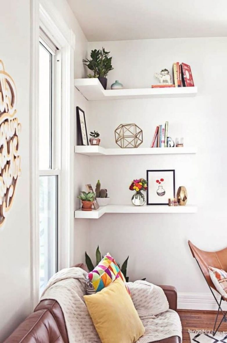 Системы хранения — то, чего всегда не хватает, даже если вы живёте в просторной квартире. А уж в небольших пространствах бой идёт за каждый сантиметр, и углы пустовать там точно не должны. Если для полноценного шкафа или стеллажа места не хватает, заполните угловое пространство компактными полками и храните на них мелочи, книги или посуду.