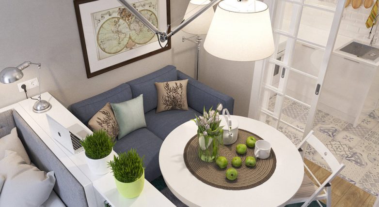 Если квартира совсем маленькая, объедините кухню с балконом и установите стол там. Только заранее решите, нужна ли вам обеденная зона. Для одних прием пищи — целый ритуал с сервировкой стола, а другим это не нужно. Например, у себя дома я так и сделал — объединил балкон с кухней, но в итоге стол оказался не нужен. Теперь вместо него стоит кресло-кровать.Используйте кофейный столик