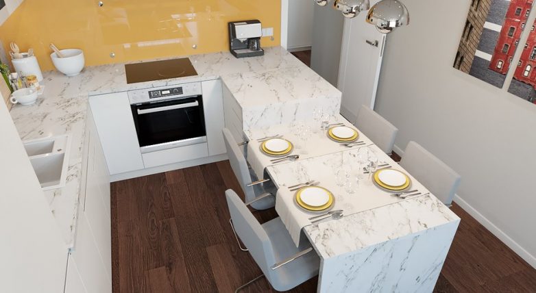 Правда, получится эффект барной стойки. Но, тем не менее, у вас будет уютное обособленное место, которое не «съест» площадь кухни. И смотреть в окно во время обеда приятно.