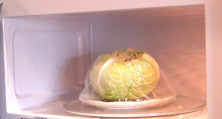 Микроволновка поможет подготовить капустные листья для голубцов. Сначала следует промыть кочан и удалить твердую часть. В печь капусту можно класть прямо в таком виде, а можно дополнительно обернуть пищевой пленкой для создания большего тепличного эффекта.
