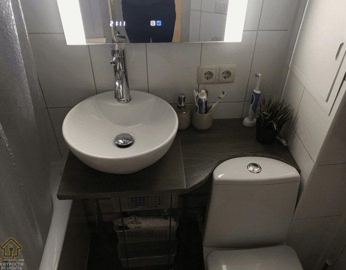 Зеркало с подсветкой и оригинальная форма вентиляции сделали помещение стильным. Ремонт получился не просто красивым, но также современным и актуальным.