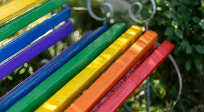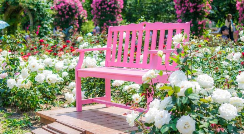 Яркая скамейка — решение на любителя. Чтобы она смотрелась выигрышно, продумайте цвет растений, которые находятся в непосредственной близости от зоны отдыха: