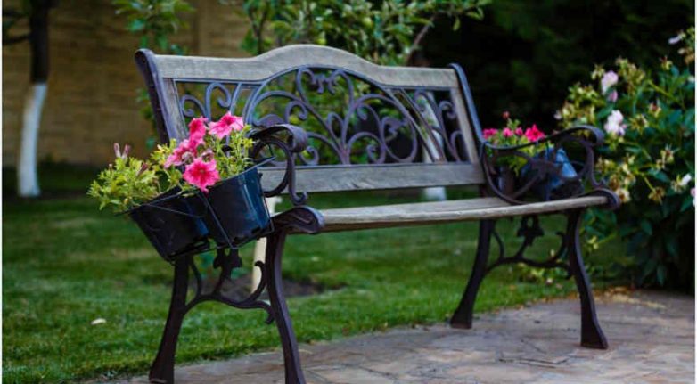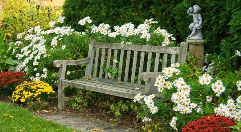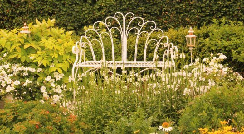 Самый простой вариант вписать скамейку — поставить ее в заросли (даже если это заросли чистотела):