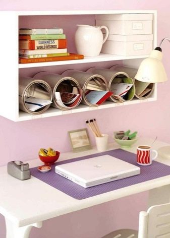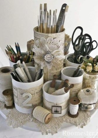 Если у вас после ремонта остались баночки от красок, вы сможете использовать и их в качестве хранения мелочей. Стоит лишь придумать, как вы украсите банку и придадите ей должный вид. Можно поработать в технике декупаж, обернуть подарочной упаковкой или вовсе украсить стразами, пайетками. Такую баночку можно повесить или поставить на полку, хранить в ней канцелярские принадлежности и прочие мелочи.