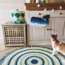 Возьмите старую вещь и начните резать ее по спирали. У вас должна получиться длинная полоска шириной не более 4-5 см. Вооружитесь крючком для вязания и начните делать цепочку из воздушных петель. Используйте полоски разного цвета, если имеете много старых вещей. Полученным ковриком украшаем коридор или любую другую комнату в доме. Подобный предмет декора смотрится оригинально, сделать его не составит особого труда. Более того, он мастерится недолго, поэтому не отнимет много времени на создание, зато уют вам точно будет гарантирован.