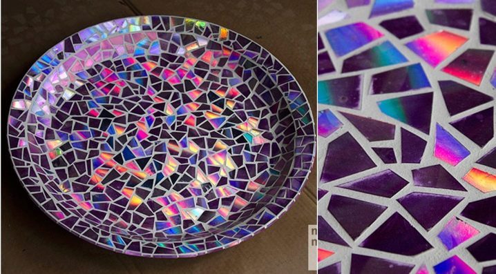 Эффектные детали из дисковНаверняка в вашем доме найдутся старые диски, которыми вы уже не пользуетесь. Такой материал сможет послужить в качестве элемента для оригинального декора. Вы можете аккуратно поломать диск на мелкие части (элементы мозаики) и обклеить ими старую тарелку. Подобный декор будет служить вам красивым дополнением к вашему интерьеру. Его можно также повесить на стену или просто поставить на журнальный столик. Изменить цвет диска можно, разукрасив его цветным маркером.