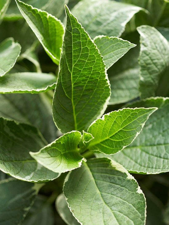 Гортензию заслуженно считают кустарником, осветляющим тень. Кустарник достигает высоты до 1,5 м, крупные листья могут быть как зелеными, так и с окантовкой. Большинство сортов морозоустойчивы, но для обильного цветения все же требуют использования укрывного материала в зимний период.