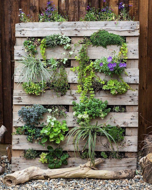 Из тех же палет можно сделать пристенные клумбы. Прикрепите палету вертикально к фасаду дома или забору и засыпьте внутрь грунт. Высаживать можно все, на что хватит вашей фантазии: цветы, зелень к столу, клубнику и даже огурцы.