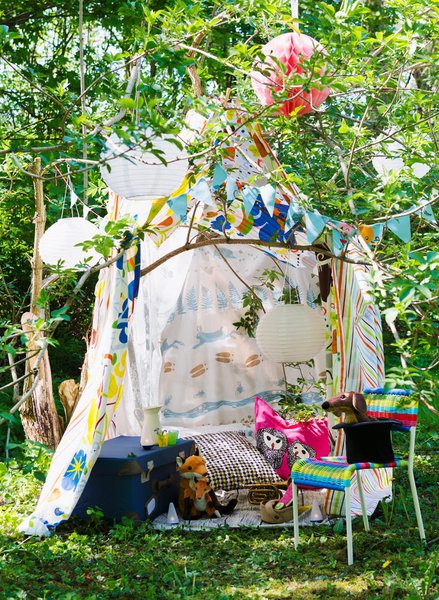 Простой шалаш понравится и детям, и взрослым, а балдахином можно украсить террасу или зону отдыха в тени деревьев на участке. Выбирайте разные ткани: можно сделать конструкцию с помощью обычного тюля или москитной сетки (будет очень кстати для защиты от насекомых) или выбрать более плотные ткани, если хотите защититься от прямых лучей солнца.