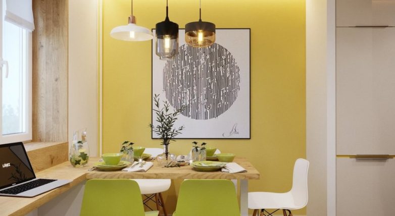 Столешница в проекте студии Lines опоясывает всю кухню и плавно переходит в обеденный стол. Отличное решение, когда из-за маленькой площади не получается оформить удобную рабочую зону.
