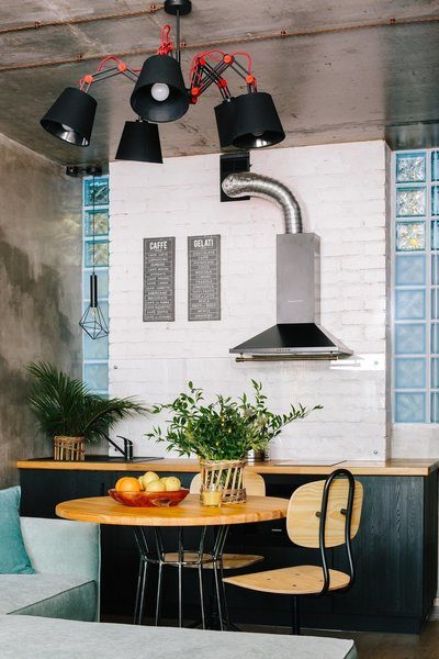 Если места в квартире совсем мало, кухню можно расположить в нише — как в проекте студии «Тор-Ард». На кухне уместились не только шкафы и духовка, но и полноценное обеденное место. Кстати, естественный свет в помещение проникает из фальшокна в перегородке.