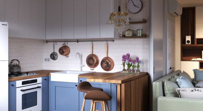 Чтобы небольшое пространство не казалось слишком тесным, можно объединить кухню с жилой комнатой, выделить ее цветом и даже спрятать в шкафу