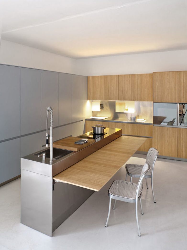 Кухонный остров — мечта любой хозяйки, но в условиях ограниченного метража от него почти всегда отказываются, в том числе в пользу обеденной группы, которую больше негде разместить. Если же ваша кухня не совсем крошечная, а иметь хотя бы небольшой остров для готовки очень хочется, решить проблему можно, совместив два в одном: выбрать модель острова с выдвигающейся или откидной столешницей.