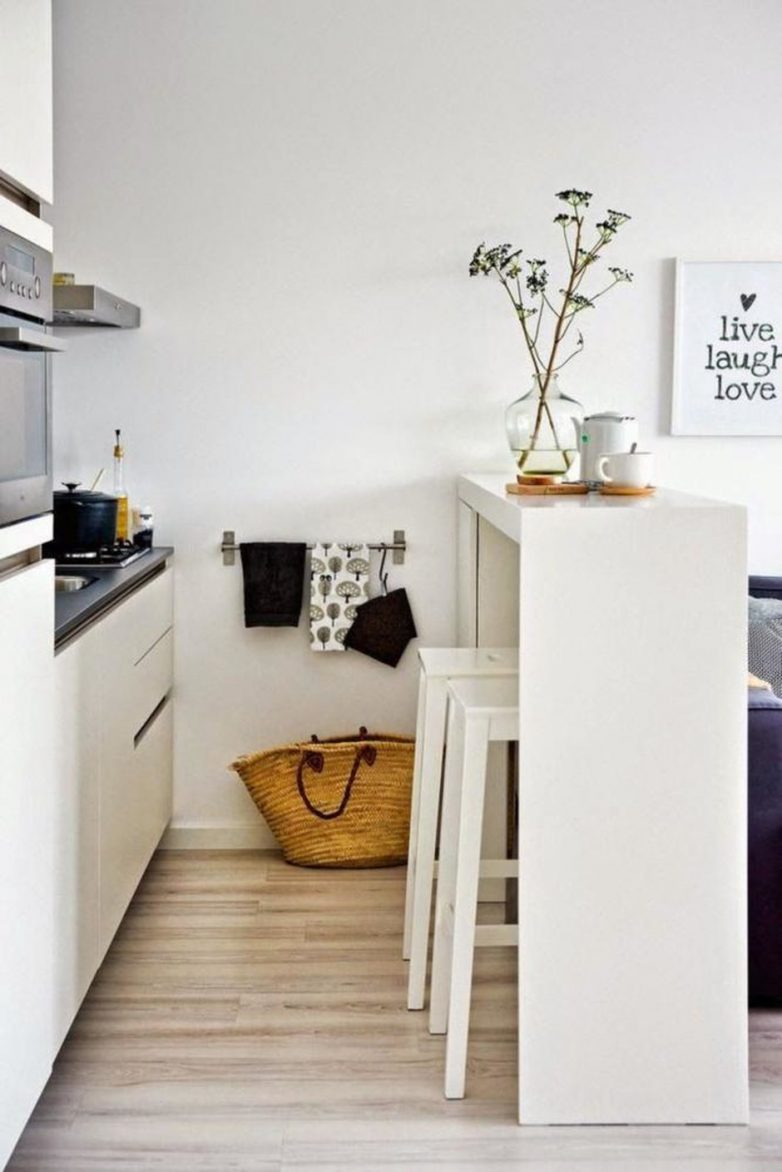 Складной столик подойдёт тем, кому в интерьере важна мобильность: его легко собрать и убрав стулья освободить место на кухне или в гостиной. В сложенном состоянии такой столик не мешает ни готовить, ни делать уборку, а внутри (если речь идёт о вмонтированной в стену модели) можно установить узкие ящики и получить дополнительную систему хранения.