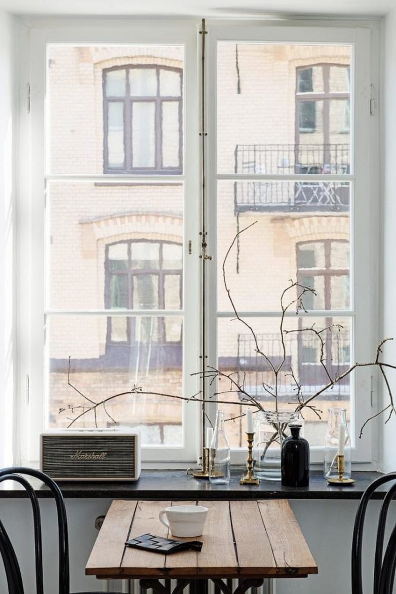 И наконец, вариант для тех, кого вид из окна если не вдохновляет, то хотя бы не удручает. На первый взгляд, обычный подоконник не играет никакой роли в организации пространства, но если убрать его, продолжить до столешницы или превратить в небольшую банкетку, разместить столовую группу у окна получится даже в самой маленькой кухне.