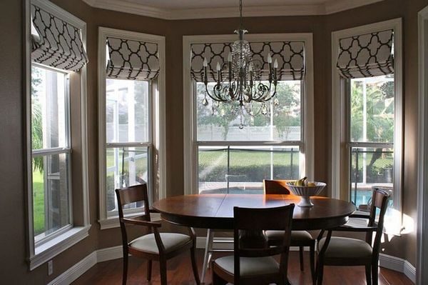 короткие шторки в самом верху окна. Они красиво смотрятся в сочетании с римскими портьерами из однотонной ткани.