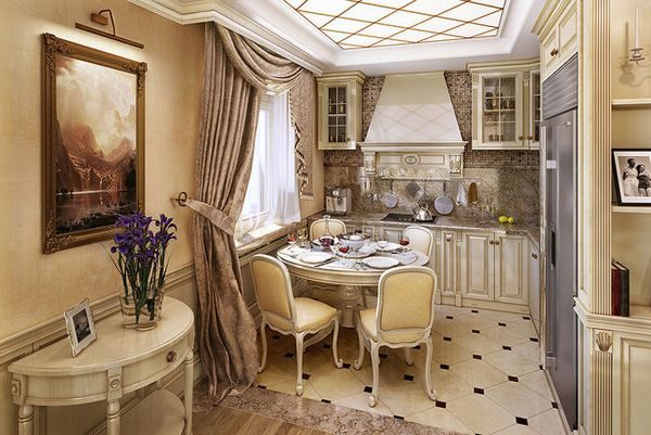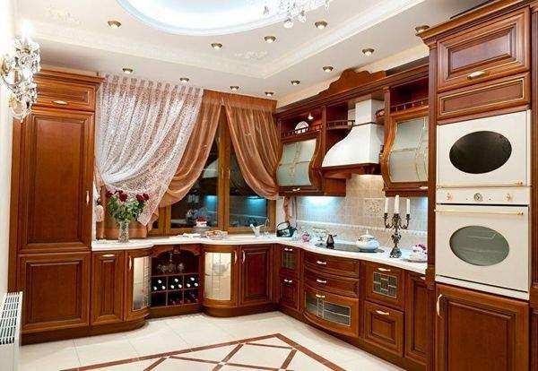 Хочется украсить кухонную занавесь тяжелыми кистями, складками и ламбрекенами? Обращайтесь к классическому стилю. Но будьте готовы выложить кругленькую сумму, т.к. для шикарного вида классических штор нужно выбирать ткани премиум класса. Шторы в классическом стиле допустимы даже на малогабаритной кухне, стоит лишь подобрать соответствующую модель и отказаться от текстиля со сложным рисунком. К тому же, как известно, классика всегда уместна и не выходит из моды.