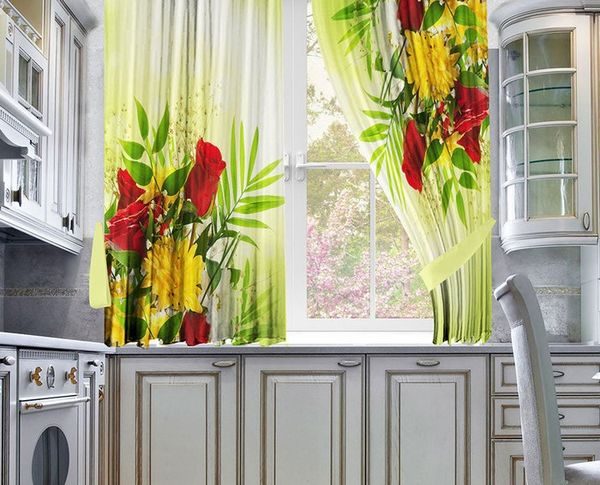 Последнее время технология ЗD дизайна набирает популярности. Вот и для кухни появились красивые и эффектные шторы с 3D рисунком. Теперь при желании вашу кухню может украсить самая настоящая картина, в роли которой выступит обычная современная кухонная штора. Согласитесь, приятно пить чай и наслаждаться реалистическим изображением любимых цветов. Особенно, если вид из окна не радует своей серостью.
