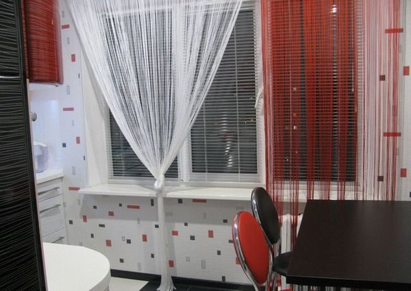 Еще одним оригинальным решением для украшения кухонного окна стали модные шторы-нити. Их ассортимент поражает своим разнообразием. Вы найдете шторы-нити любого оттенка, с бисером или люрексом, короткие и в пол — любой характеристики, какой вы пожелаете. Данный вид штор прекрасно смотрится как самостоятельно, так и в сочетании с однотонными прозрачными гардинами. Читайте также в статье нашего проекта dekorin. me об оформлении кухонного окна римскими шторами.