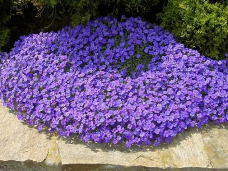 Обриета. Яркий представитель ковровых, идеальный для альпинариев. Может использоваться в качестве обрамления клумб и в самостоятельных посадках. Цветет полтора месяца с мая, а после обрезки может повторить этот процесс. Зимует с листочками, которые привлекательно смотрятся ранней весной. Нужно иметь в виду, что обриета разрастается агрессивно, как и дюшенея, — оба эти вида могут подавлять, даже выживать соседей.