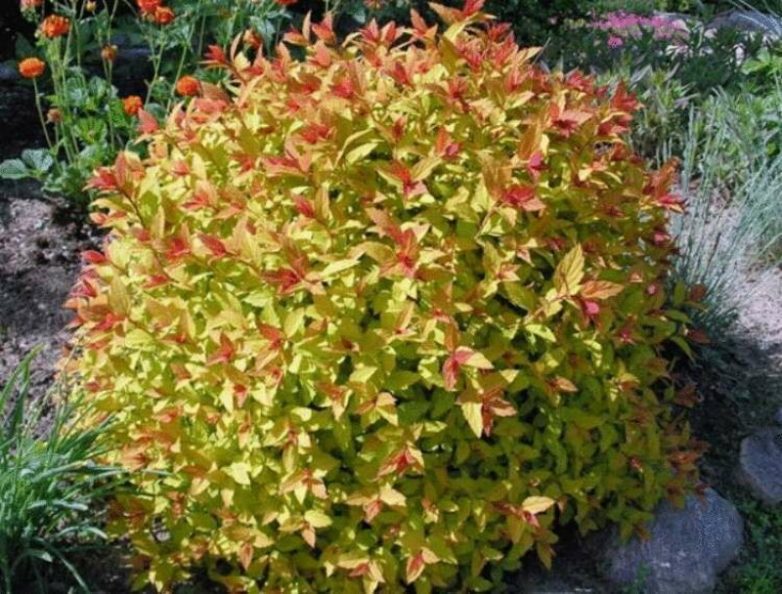 Спирея японская. Компактный стелющийся куст. Многочисленные розоватые соцветия образующиеся в середине лета, украшают кустики на протяжении полутора месяцев. Оригинальны золотисто-желтые листья. Спирея нетребовательна к условиям, зимостойка, солнцелюбива.