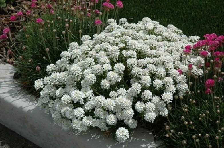 Иберис одинаково хорошо растет на солнце и в тенистом месте, почву любит легкую, воздухопроницаемую. Имеет небольшие ароматные чаще белоснежные соцветия, но есть сорта с розовой, карминной, лиловой окраской. Цветение длится два месяца, начиная с мая. Великолепно сочетается в комбинированных цветниках. Например, соседство белого ибериса и мелких красных цветов гвоздики для клумбы весьма выигрышный вариант.