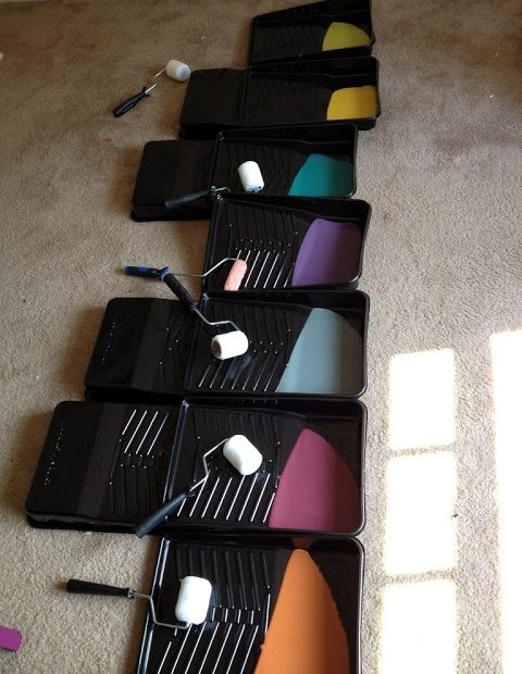 Подготовьте лотки и отдельные валики для каждого цвета. Можно обойтись и одним, но его придется промывать и сушить после каждого цвета. Покройте каждый «кирпичик» краской в два-три слоя, в зависимости от плотности краски.
