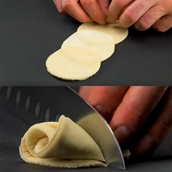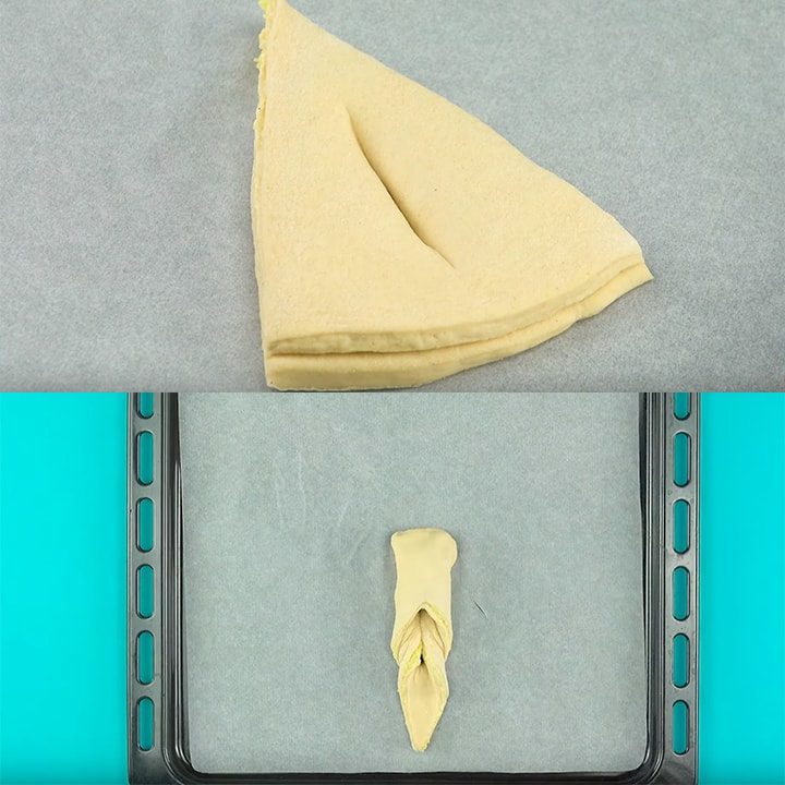Разделите тесто посередине, оберните им небольшую миску. Ножницами надрежьте тесто по всей окружности.