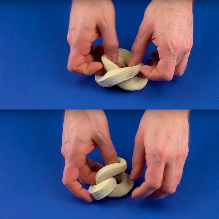 Раскатайте тесто в толстый пласт, вырежете колечки. Это можно сделать с помощью винного бокала и рюмки. Протяните края одного колечка через другое, завернув через край, чтобы получить косичку.