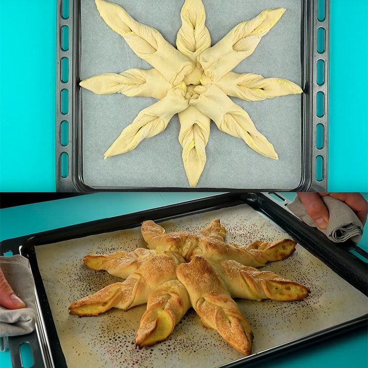 Покройте тесто слоем ванильного пудинга. Накройте вторым слоем теста. Ножом для пиццы разрежьте пирог на восемь частей. Каждый кусочек надрежьте посередине. Выверните кончик сквозь разрез. Выложите остальные части в форме звезды, присыпьте сахаром.