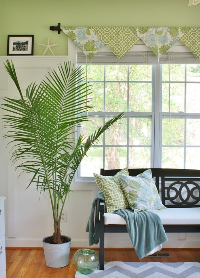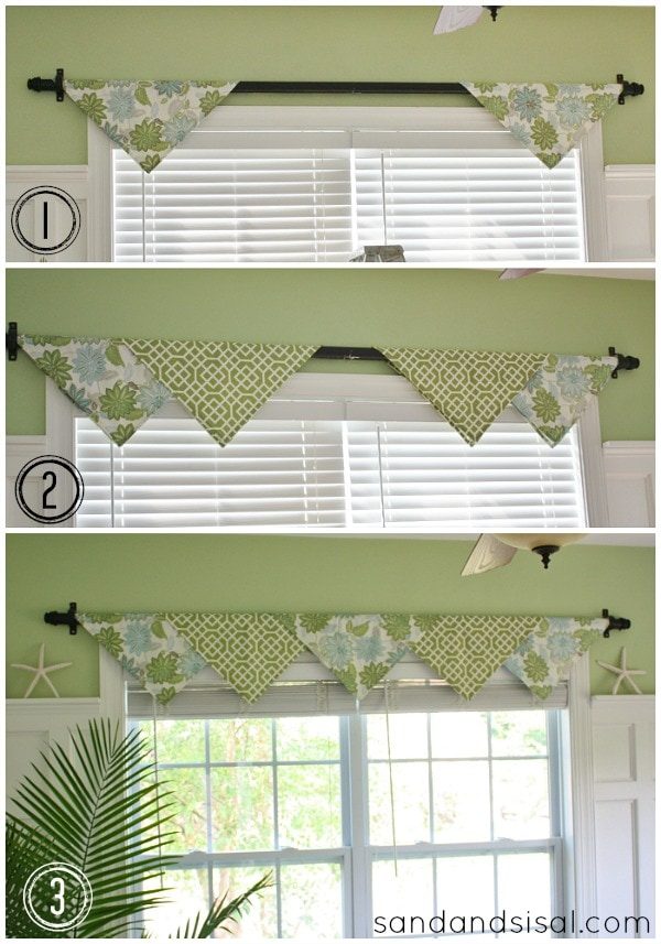 Тщательно прогладьте салфетки, чтобы на них не осталось складок. Осталось только сложить салфетки на карниз, начиная от краев (см. фото 1). Тканевые салфетки хорошо держатся без шитья или клея. Лучше всего смотрится нечётное количество салфеток — распределите их на карнизе соответствующим образом.