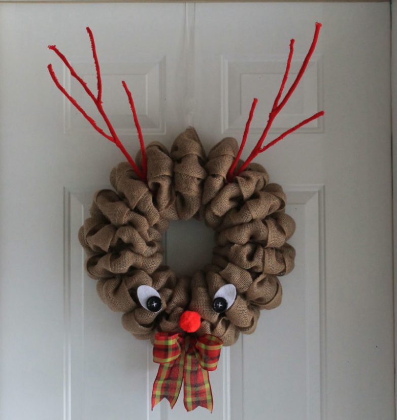 Оригинальный венок из мешковины станет настоящим украшением дома.