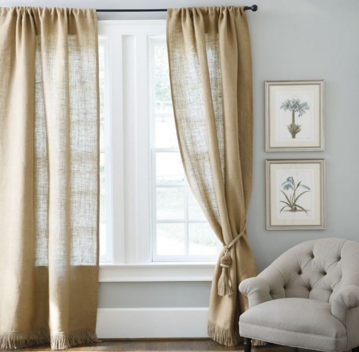 Простой, но в тоже время интересный вариант оформления окон – шторы из мешковины.