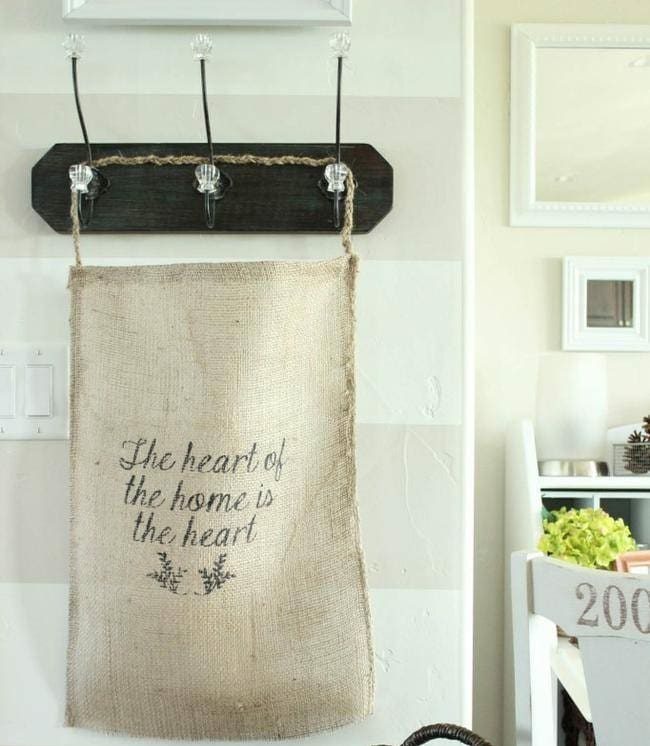 Обшив кусочек мешковины толстой бечевкой по краям и сделав на материале надпись или вышивку, можно получить прекрасное украшение для дома.