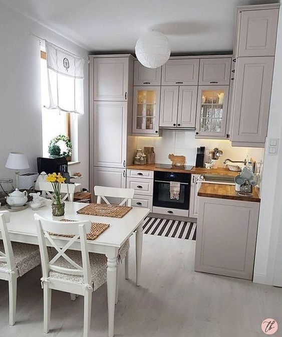 Просто, чисто, свежо и со вкусом — а высокие шкафчики добавляют больше места для хранения на небольшой кухне