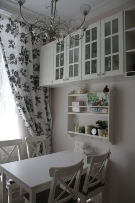 Шторы и необычная люстра могут стать прекрасным дополнением белоснежной кухни