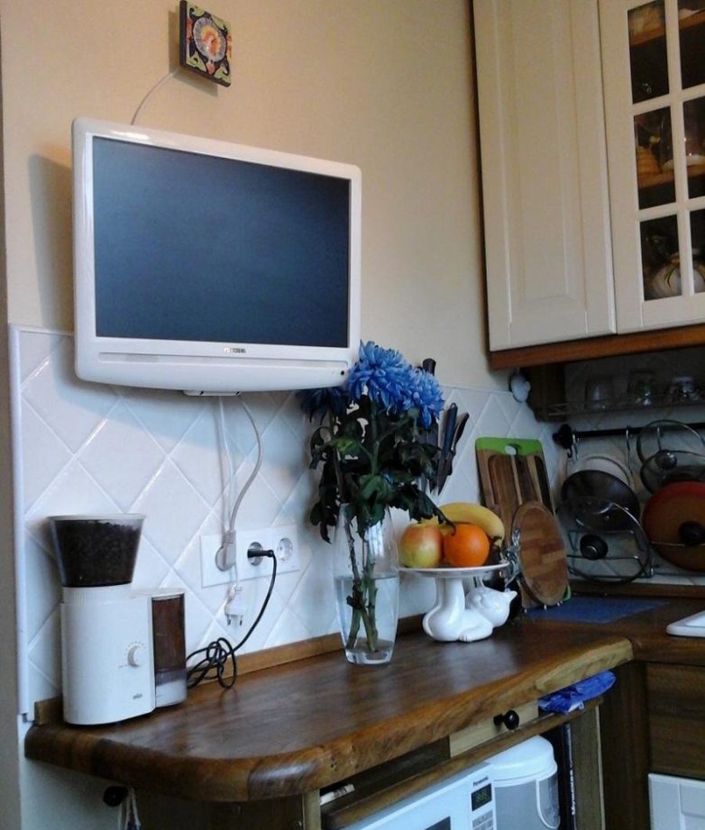 Смотреть телевизор, задирая голову так высоко, не очень удобно. Однако другого места для телевизора в небольшой кухне зачастую не находится.