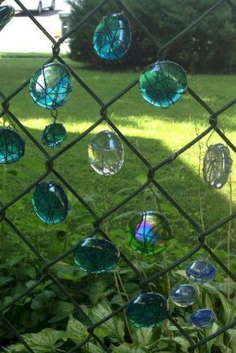 Украсьте забор из рабицы небольшими стекляшками. Они будут переливаться на солнце, как драгоценные камни.