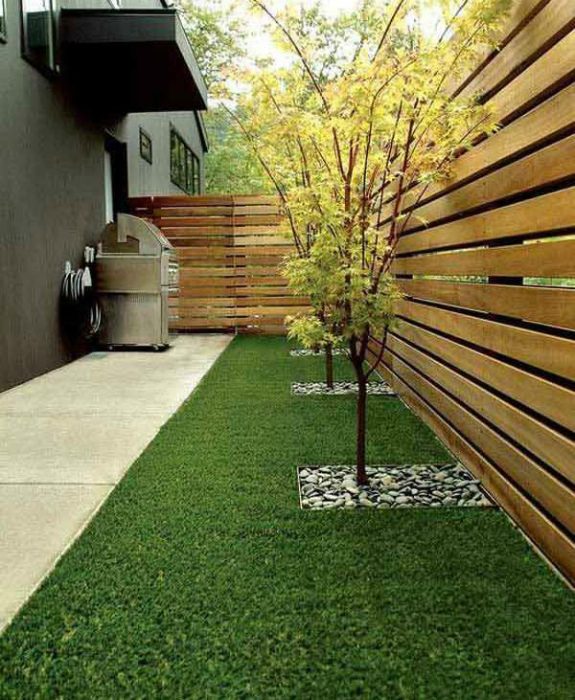 Высокий забор из длинных деревянных досок, закрепленных горизонтально, выглядит очень просто, стильно и современно. Такое ограждение прекрасный способ спрятаться от посторонних глаз, не перекрыв источник естественного освещения.