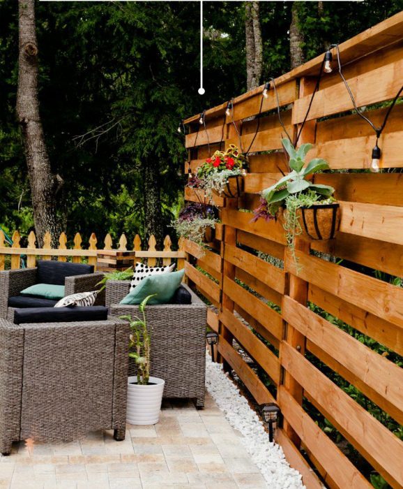 Деревянные поддоны — это доступный материал для стильных поделок. Один из способов использования паллет — сооружение забора. А чтобы секции ограждения не отличались по цвету и выглядели привлекательно, не забудьте предварительно покрасить поддоны в приятный натуральный оттенок.