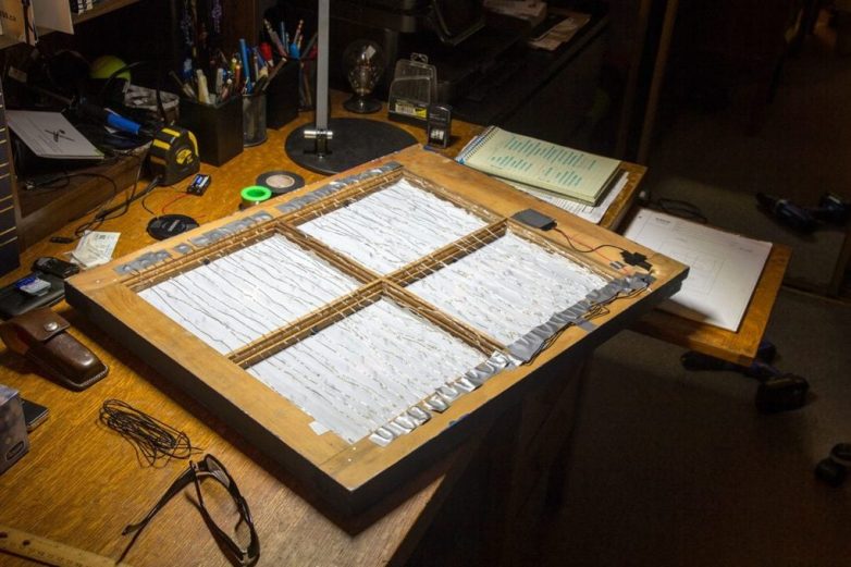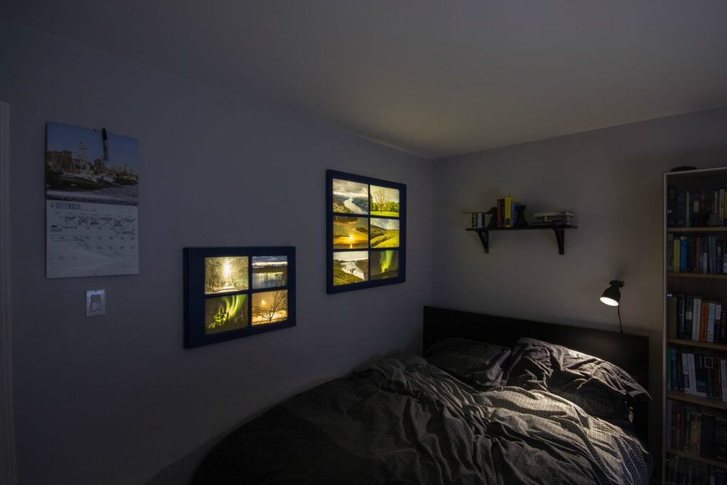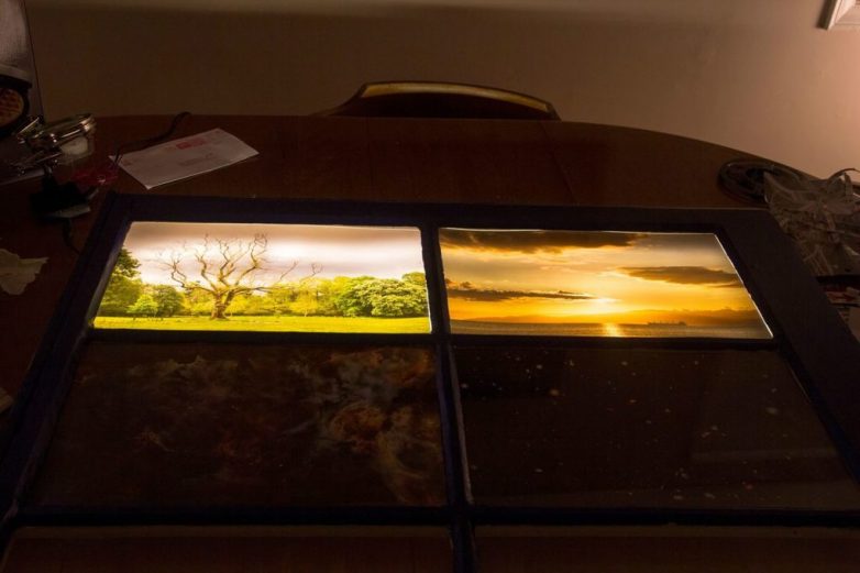 Эти два лайтбокса (плаката с подсветкой) сделаны из отслуживших оконных рам. В них встроена светодиодная лента, а радиочастотный выключатель спрятан под кроватью.